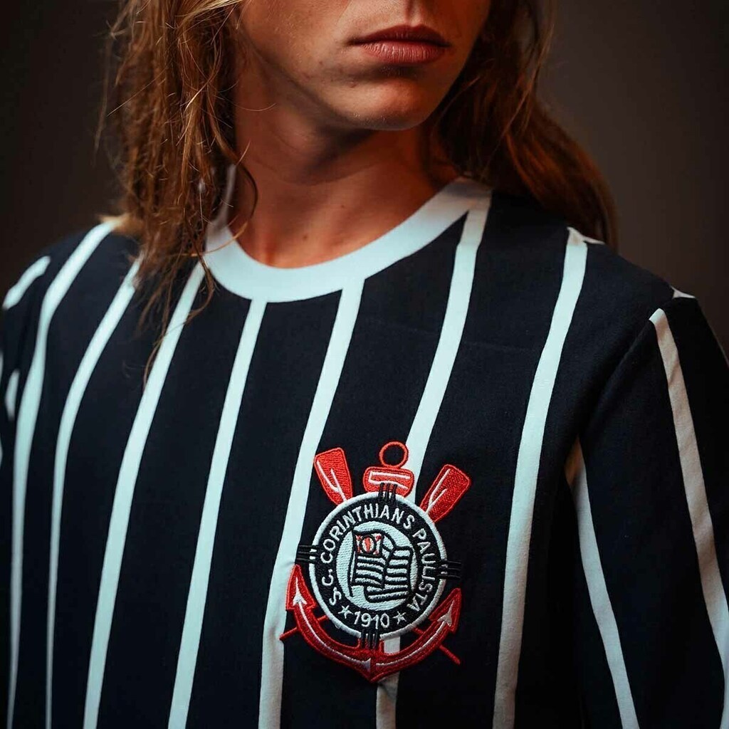 Com listras verticais brancas e pretas que remetem ao uniforme histórico do clube, a camiseta traz o escudo bordado no peito e, nas costas, a icônica estampa “Democracia Corinthiana”, homenageando um dos movimentos mais emblemáticos do futebol brasileiro.