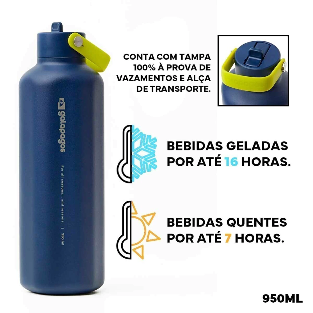 - Isolamento a vácuo, evitando o suor no exterior da garrafa.
