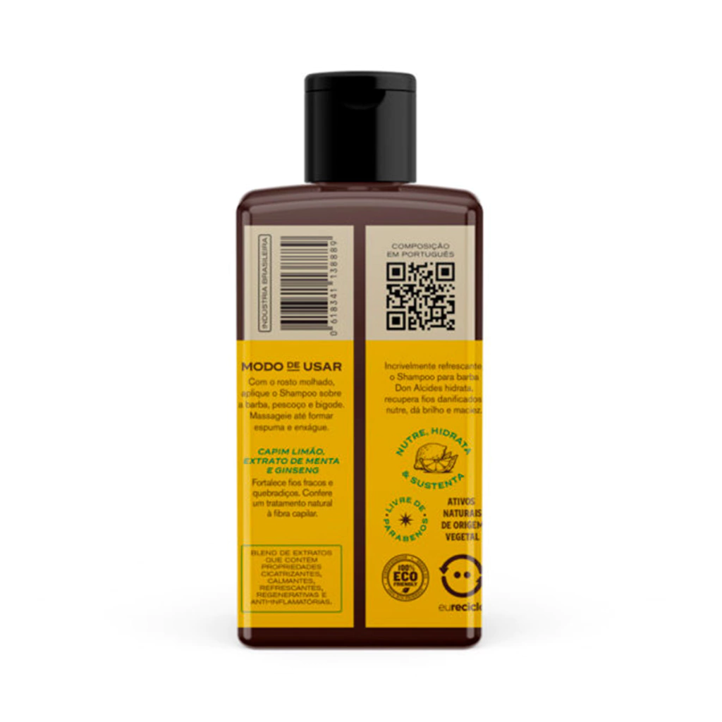 Incrivelmente refrescante, o Shampoo para barba Don Alcides Lemon Bone hidrata, recupera fios danificados, nutre, dá brilho e maciez.
