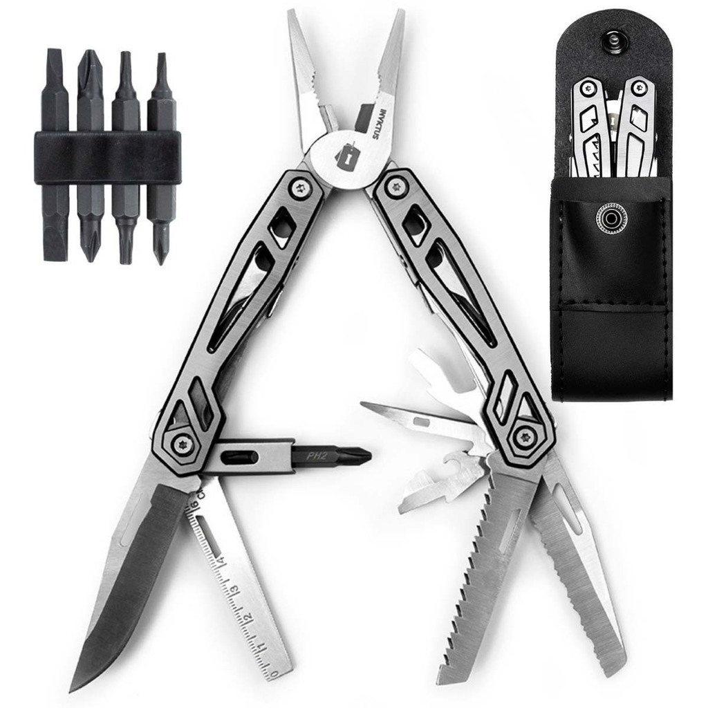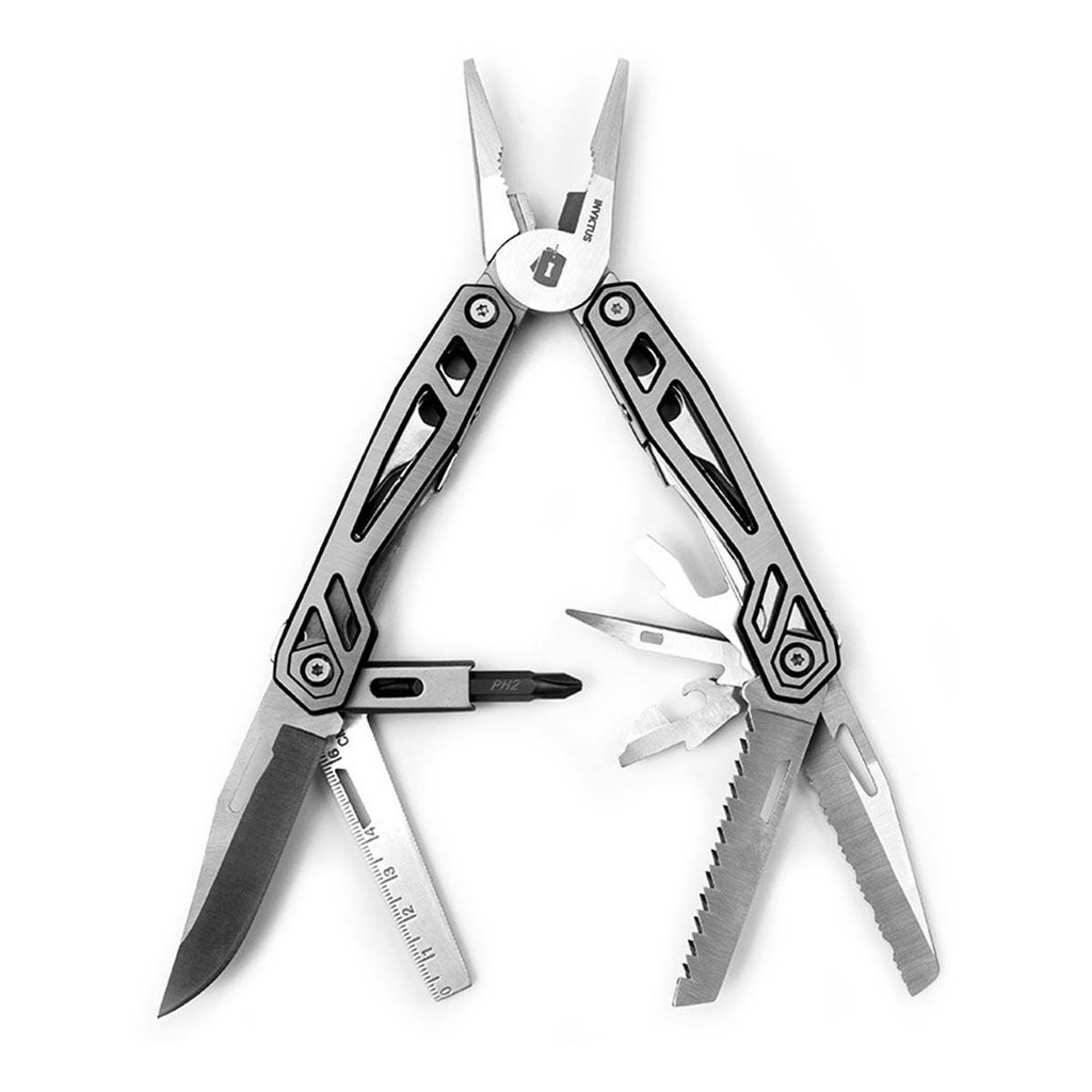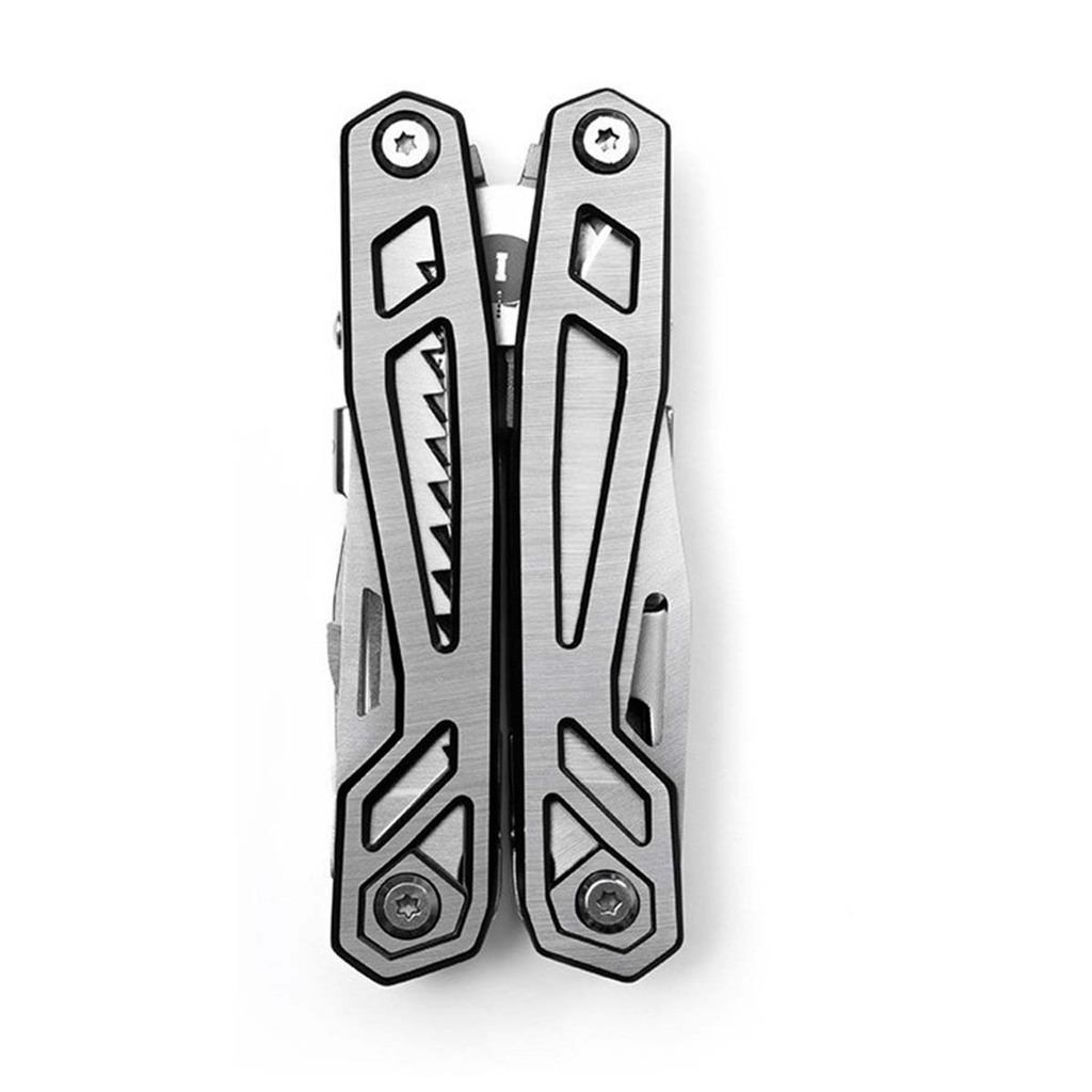 Possui 12 funções: alicate, faca, lâmina serrilhada, abridor de garrafas, abridor de latas, lâmina fina, lâmina serra, porta-bits, lima/régua, bit chave de fenda, bit chave Philips e bit chave torx